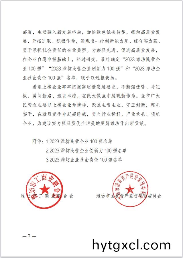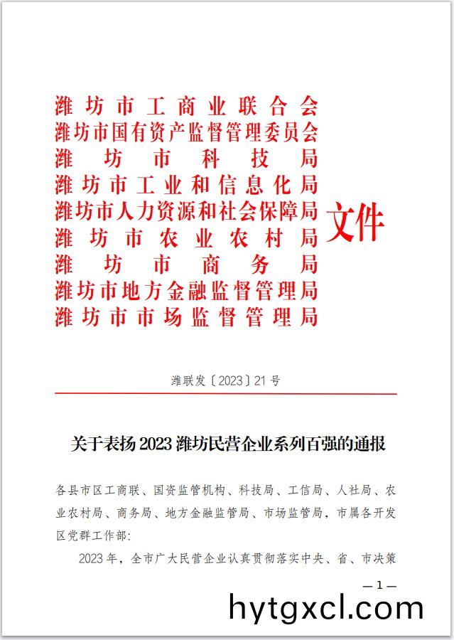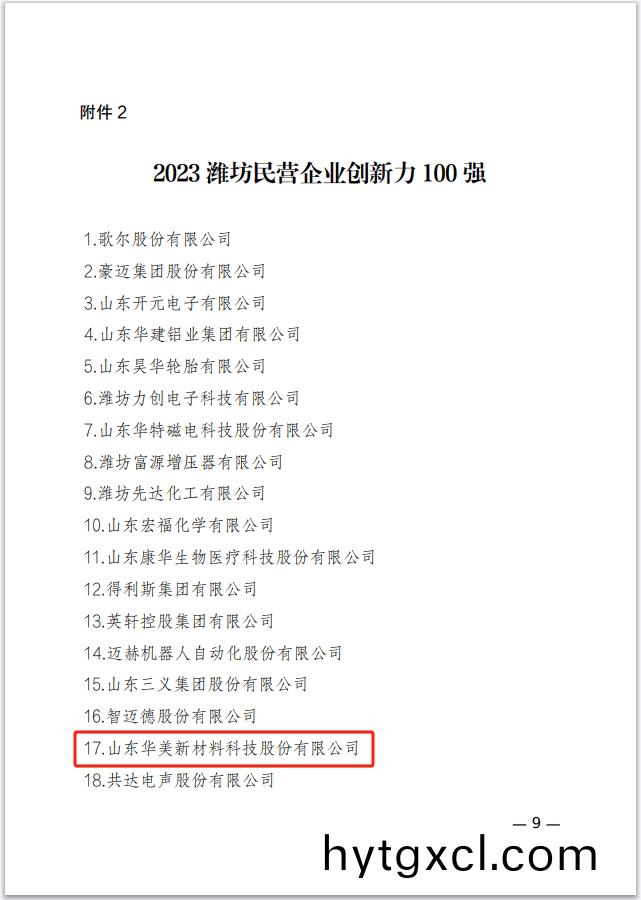热(re)烈祝贺华美新材(cai)成功(gong)入选2023潍(wei)坊民(min)营(ying)企(qi)业创新(xin)力(li)100强(qiang)