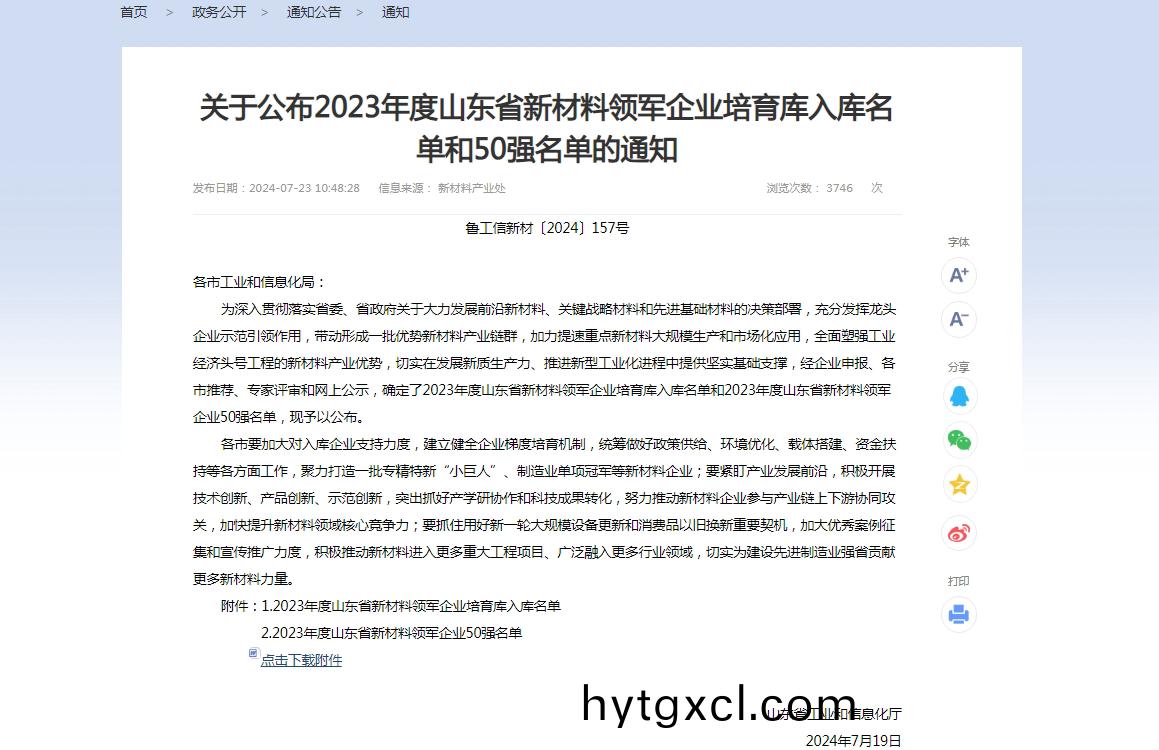 【概(gai)要描述】关于(yu)公(gong)布(bu)2023年(nian)度(du)山(shan)东省(sheng)新材(cai)料(liao)领军(jun)企(qi)业(ye)培(pei)育(yu)库入库名(ming)单和50强名单的通知(zhi)